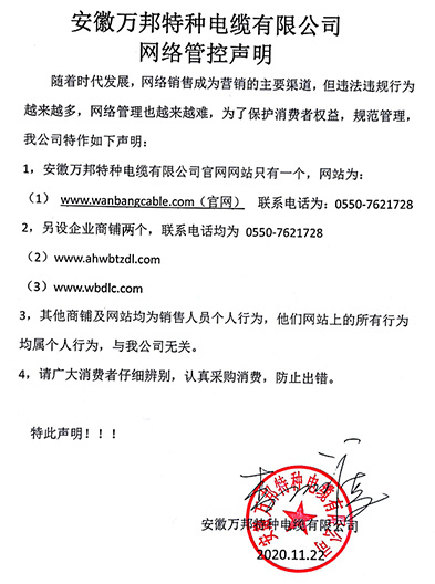 鄭重聲明:安徽萬邦特種電纜有限公司官方網站為:www_wanbangcable_com.huapuou.com.cn,除此之外無任何子網站或合作網站,其余均為假冒偽劣。電話:0550-7621728 13485756353 地 址:安徽省天長市滁州高新技術產業開發區經四路29號